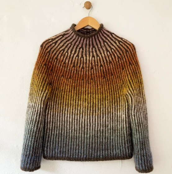 Garnpakke til Branch Jumper - fade indeholder garn, Snefnug og Midnatssol fra CaMaRose, som vist på foto